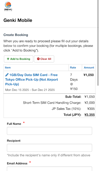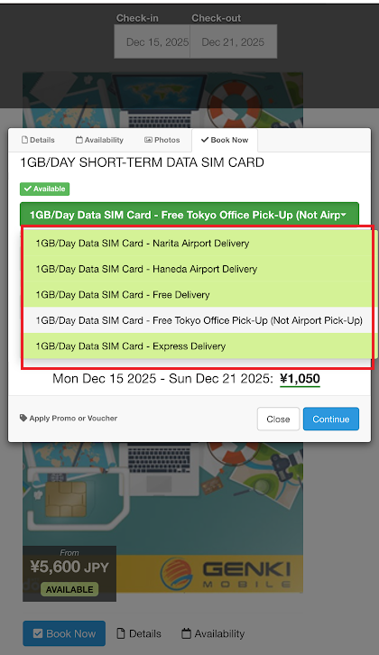 In the dropdown, you can choose airport pickup at Narita or Haneda, so your SIM is ready for pickup right after you land. You can also choose delivery to a hotel, Airbnb, or another address in Japan, or pick up from our office in Tokyo.