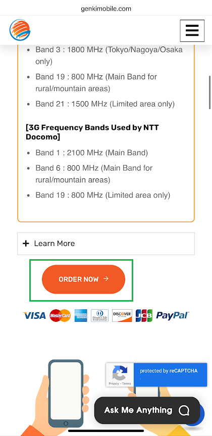 If you scroll down a little bit, you can also see the 3G/LTE Frequency bands compatible with Docomo. Please click the order now button below the table once you are done exploring about the travel SIM.